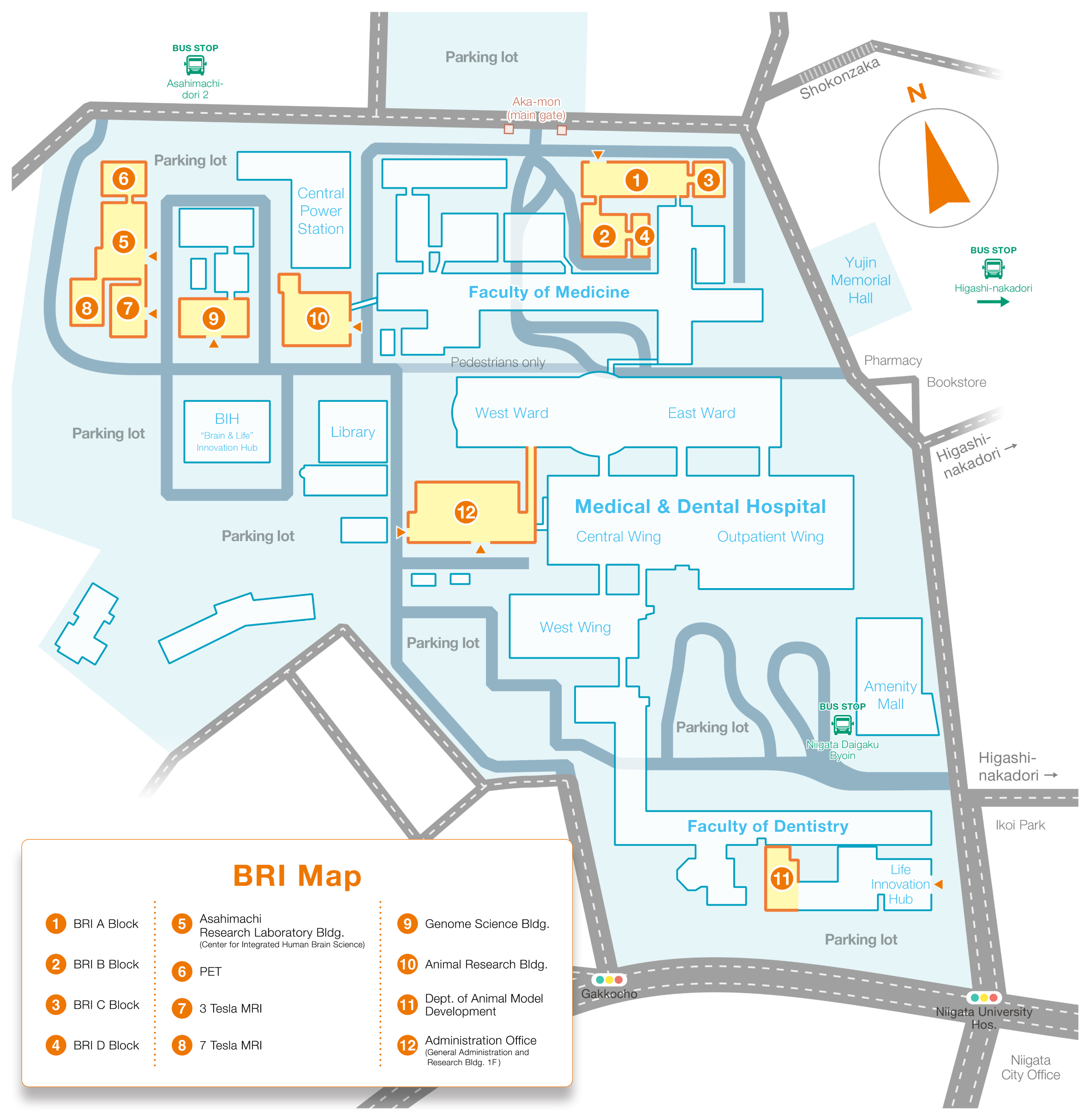 #B10, #B12, #S61 bound for Shiyakusho Mae [City Office] #B10 bound for Hakusaneki Mae [Hakusan Sta.] #B11 bound for Aoyama itchome [Aoyama 1] #B13 bound for Seibu Eigyosho [Seibu Bus Depot] #W30, #W40 bound for Uchino Eigyosho [Uchino Bus Depot] #W31 bound for Niigata Daigaku [Niigata University] #W32, #W42 bound for Shinrakuen Byoin [Shinrakuen Hospital] ![]() ![]() and walk 10 mins to BRI. ![]() approx. 15 mins