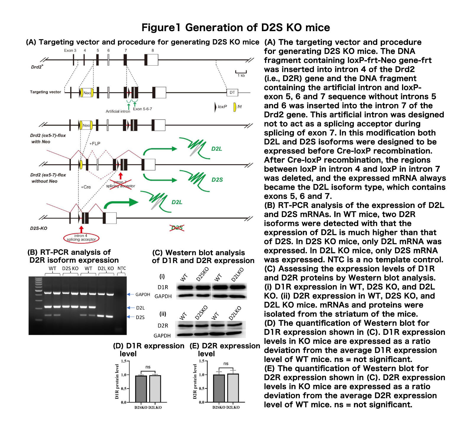 Collaborative research groups including Associate Professor YanYan Wang, Dr. Mohd Tayyab, and Dr. Anetta Ninan from the University of Texas at Tyler, and Professor Toshikuni Sasaoka, Technical Staff Member Nae Saito (then), Associate Professor Manabu Abe, and Professor Emeritus Kenji Sakimura at Niigata University conducted research to investigate the role of dopamine D2 receptor (D2R) isoforms in alcohol use disorder. The research aimed to examine whether differential expression of D2R isoforms affects the reinforcing effects of alcohol and its associated molecular signaling. Through collaboration between the University of Texas at Tyler and Niigata University, the team generated novel D2S knockout (KO) mice―expressing only the D2L isoform―using Cre-loxP-based gene editing (Figure 1), complementing existing D2L KO mice that express only the D2S isoform (Figure 1). Behavioral assays, including conditioned place preference (CPP), open-field, elevated zero-maze, and rotarod tests, were conducted along with chronic alcohol exposure to evaluate motor coordination and reward sensitivity. Molecular and biochemical analyses (RT-PCR, qPCR, Western blotting) of striatal tissue were subsequently performed to assess changes in cannabinoid receptor expression, Akt signaling, and dopaminergic and synaptic plasticity-related genes. The key findings were that D2L KO mice, with elevated D2S expression, displayed strong alcohol-induced CPP and downregulation of cannabinoid type 1 receptors (CB1R), phosphorylation of Akt (p-Akt), tyrosine hydroxylase (TH), activity-regulated cytoskeleton-associated protein (Arc), and resistin (RETN), but upregulation of cannabinoid type 2 receptors (CB2R), and these changes were absent in WT and D2S KO mice (Figure 2). These results demonstrate that the relative abundance of D2S to D2L critically modulates alcohol reward and its associated signaling, providing molecular insight into the neurobiological basis of alcoholism.