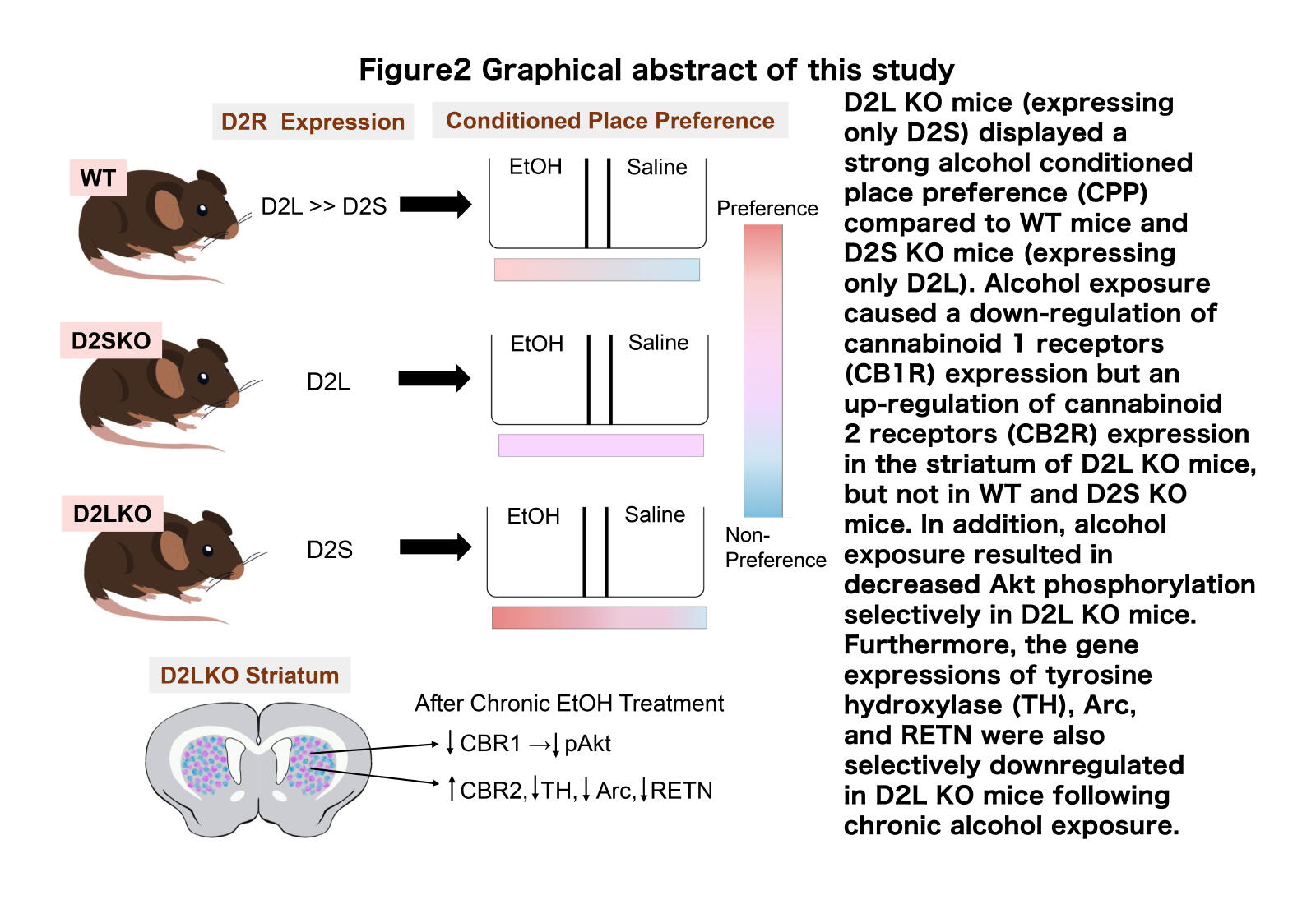 This study elucidates the distinct roles of the two dopamine D2 receptor (D2R) isoforms―D2 long (D2L) and D2 short (D2S)―in alcohol-induced reward and neural signaling. Using genetically engineered knockout (KO) mice that selectively express either D2L or D2S, the researchers found that D2L KO mice, which express only D2S (Figure 1B), exhibited a pronounced conditioned place preference (CPP) to alcohol, whereas wild-type (WT) and D2S KO mice, which express only D2L (Figure 1) did not. Chronic alcohol exposure in D2L KO mice led to downregulation of cannabinoid type 1 receptors (CB1R), upregulation of cannabinoid type 2 receptors (CB2R), and reduced phosphorylation of Akt in the striatum (Figure 2). Additionally, alcohol exposure specifically reduced the expression of tyrosine hydroxylase (TH), activity-regulated cytoskeleton-associated protein (Arc), and resistin (RETN) genes in D2L KO mice (Figure 2). These results indicate that an increased D2S/D2L ratio profoundly influences alcohol reward behavior and striatal gene regulation, likely through the cannabinoid-Akt signaling cascade. The findings suggest that if altered splicing of the D2R gene results in higher D2S expression relative to D2L, it may lead to susceptibility to alcohol use disorder (AUD) by enhancing alcohol-induced reward signaling.