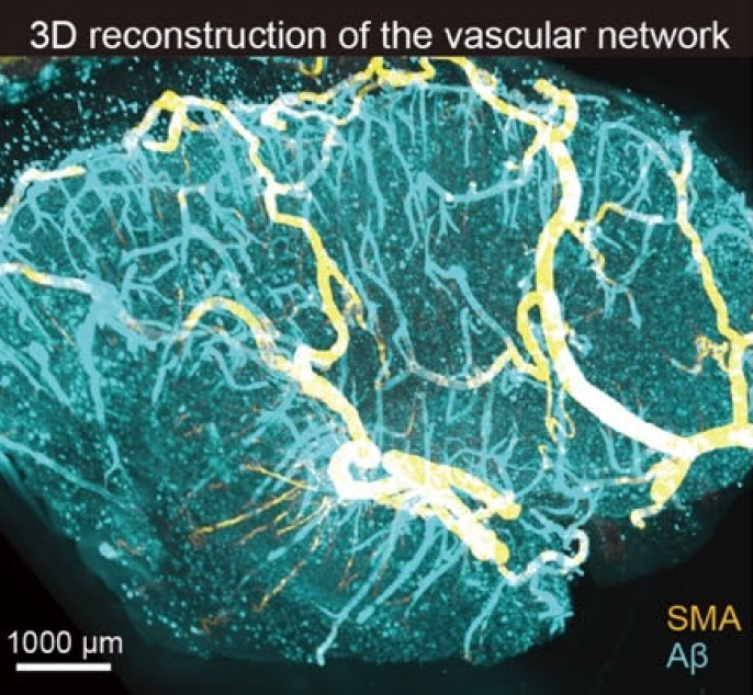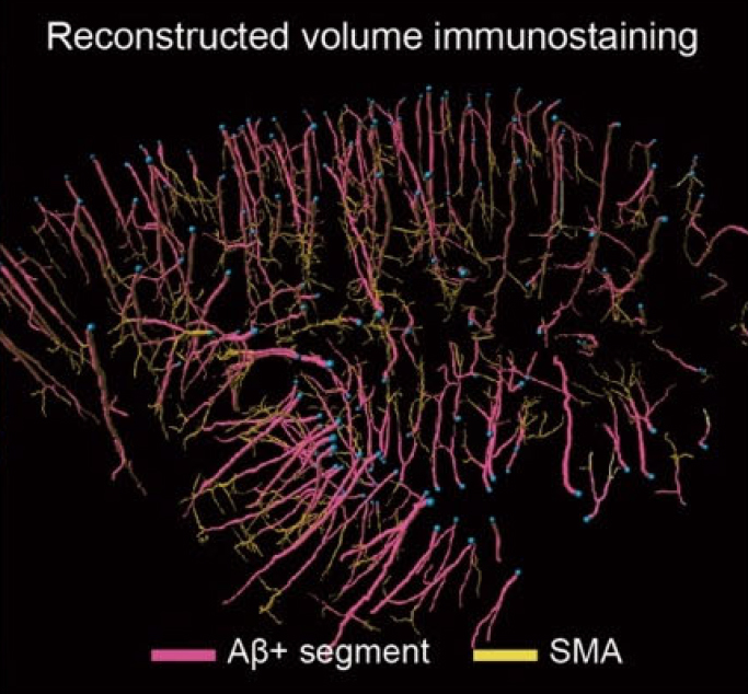 Using postmortem human brain tissue, three-dimensional imaging revealed vascular Aβ deposition patterns and a lower density of parenchymal amyloid plaques surrounding Aβ-positive vessels. Smooth muscle actin (SMA) (yellow) and Aβ (blue).