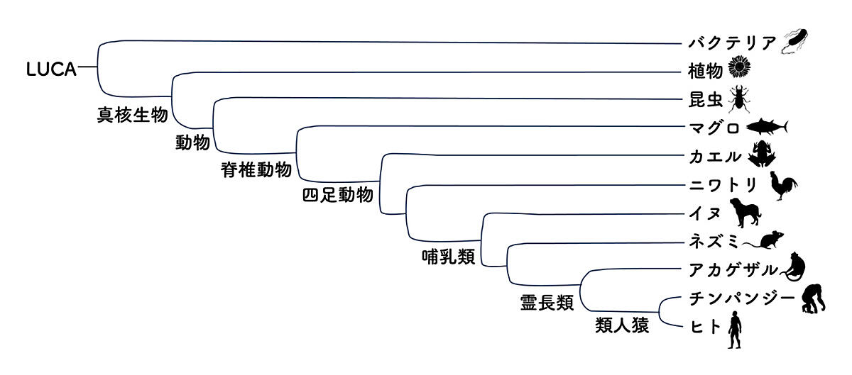 進化は、化石記録や現存する生物の比較解析、あるいは世代時間が短い生物を使った進化実験から、その存在が証明されてきた生物の本質的性質です。ダーウィンが「種の起源」1を出版して以来、世界中の研究者によって、進化の歴史とメカニズムが明らかにされてきました。現在では、全ての生物はルカ(LUCA)という一つの共通の祖先をもつことが知られています2。あらゆる生物はルカから進化する過程で、他の生物たちと分かれて、最終的に一つの種として現存しています。例えば、ヒトが進化するまでには、真核生物の進化、動物の進化、脊椎動物の進化、四足動物の進化、哺乳類の進化、霊長類の進化、類人猿の進化を経て、現在にいたります(図1)。このような他の生物との枝分かれを示した図を系統樹といいます。生物多様性は、系統樹にみられるように多くの種が分かれるとともに独自の特徴を進化させてきた結果生まれてきたものです。それでは、このような進化はどのように生じるのでしょうか。