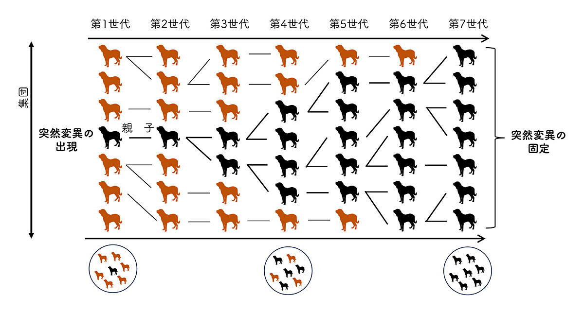 図2.集団に現れた突然変異が固定するプロセスの模式図