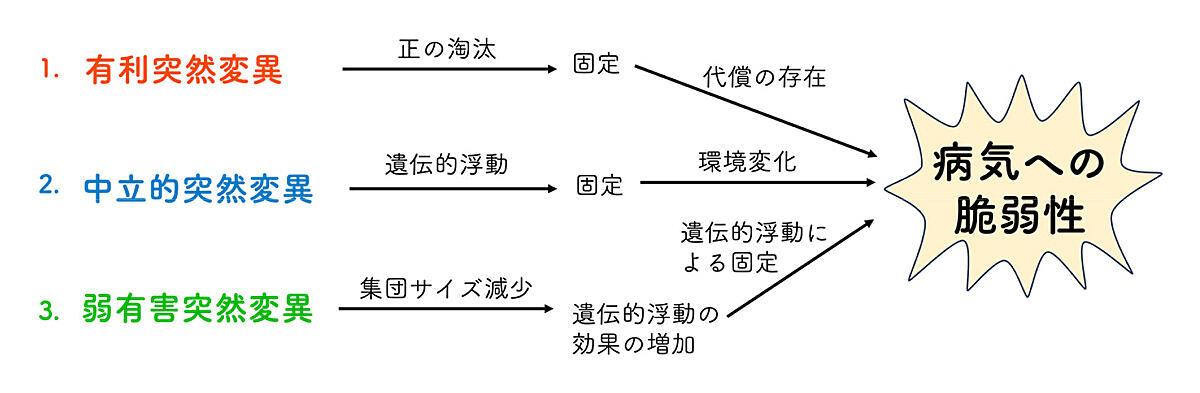 以上の枠組みを踏まえ、なぜ病気に対する脆弱性が進化し得るのかを議論します。ここでは病気を作り出す遺伝的因子全体について話す上で、病気のリスク因子に似たものを考えます。集団中にその突然変異が固定していないのであれば、それはリスク因子といえますが、固定してしまうと、その特徴はもはやその集団(あるいは種)の一般的な病気のメカニズムの基盤となるからです。一方で、家族性遺伝病の原因因子のように病気に直結する突然変異は、集団に固定していないからこそ遺伝病であるので本稿では扱いませんが、その広がり方については類似の議論が可能だと思います。この突然変異が集団に固定するプロセスには、少なくとも次の三つが考えられます(図3)。