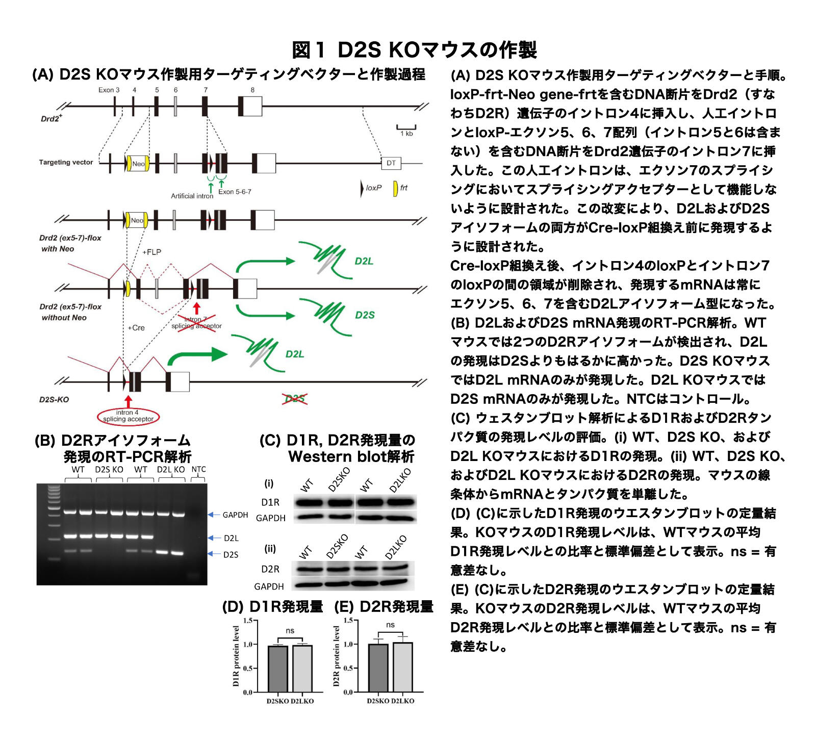 D2Rは、メッセンジャーRNA(mRNA)の選択的スプライシングにより、D2ロング型(D2L)とD2ショート型(D2S)の2つのアイソフォームが生成されます。D2LとD2Sの発現量の違いがアルコール使用傷害に影響を与えるかを調べるため、D2LまたはD2Sのみを発現するノックアウト(KO)マウス (図1) を用いて、D2LとD2Sいずれかの発現量の変化が、報酬関連行動および関連するシグナル伝達経路におけるアルコール反応に影響を与えるかを調べました。