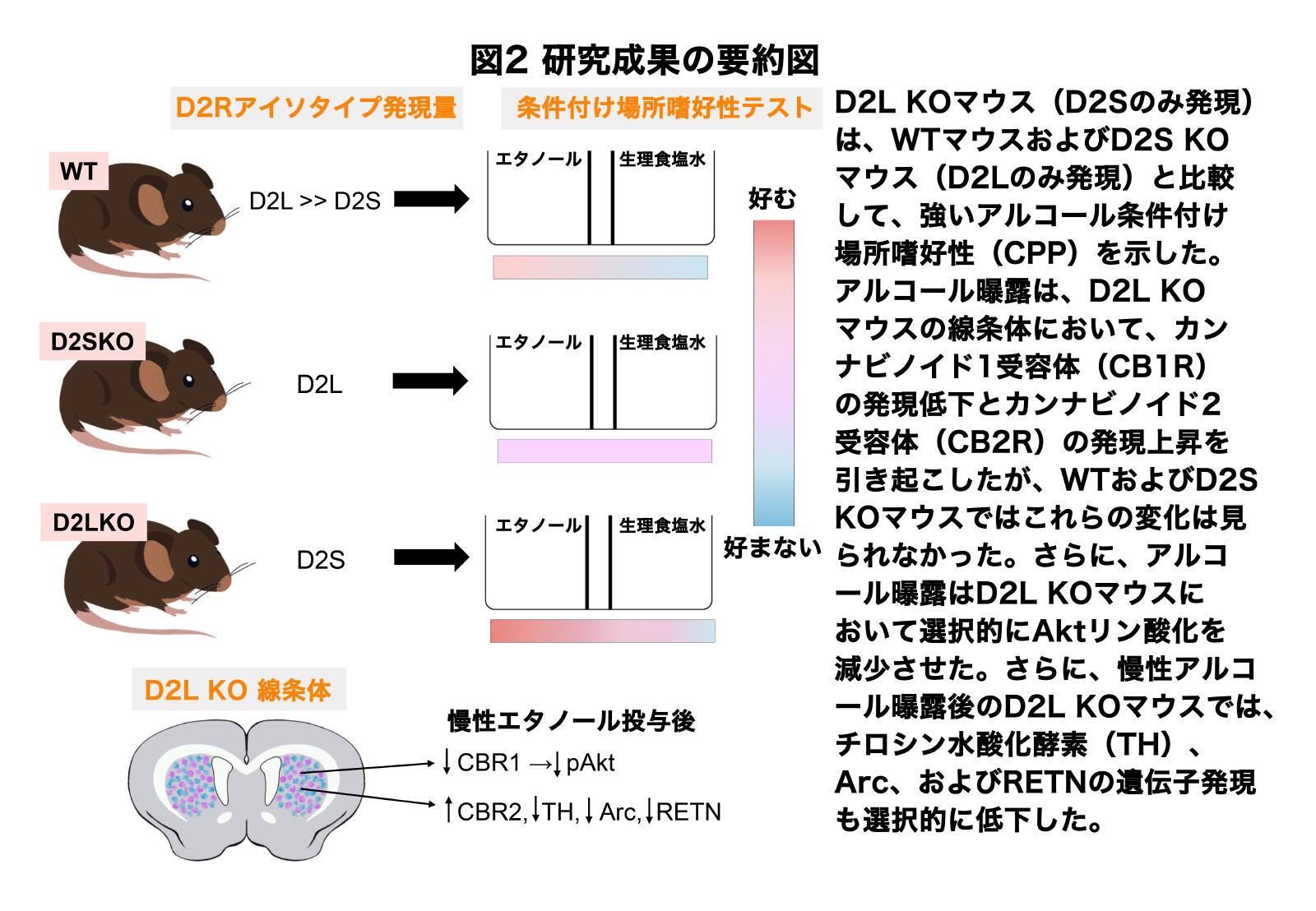 その結果、D2L KOマウス(D2Sのみを発現)は、野生型(WT)マウス(D2L発現量がD2S発現量よりはるかに多い)およびD2S KOマウス(D2Lのみを発現)と比較して、強いアルコール条件付け場所嗜好性(CPP)を示すことがわかりました。アルコール曝露は、D2L KOマウスの線条体においてカンナビノイド1受容体(CB1R)の発現を抑制し、カンナビノイド2受容体(CB2R)の発現を上昇させましたが、WTおよびD2S KOマウスではこの変化は見られませんでした。さらに、アルコール曝露はD2L KOマウスにおいて選択的にAktリン酸化を減少させました。さらに、チロシン水酸化酵素(TH)、Arc、およびresistin (RETN)の遺伝子発現も、慢性アルコール曝露後のD2L KOマウスにおいて選択的に減少しました。