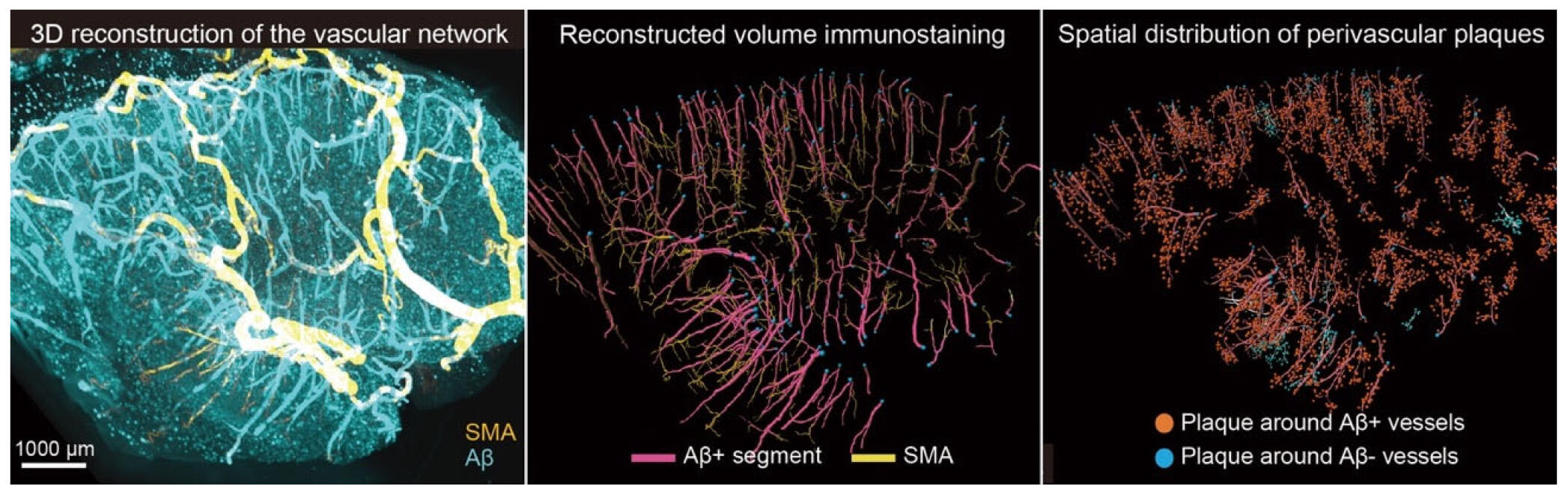 - 組織透明化と光シート顕微鏡を用いた3D解析により、ひとの脳で血管網全体とAβ沈着、老人斑の空間分布を包括的に可視化した。