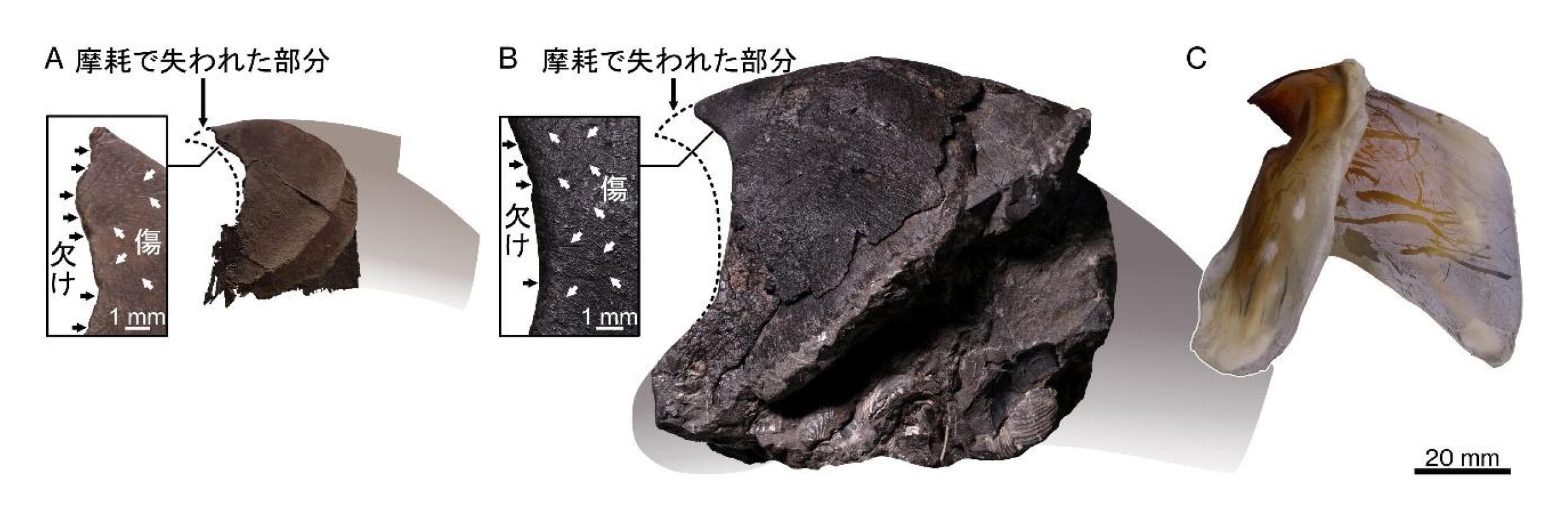 顎化石表面には大きな欠けや傷などの摩耗痕があり、その積み重ねで失われた部分は顎の全長の10%近くに達することが分かりました(図1)。さらに、噛む部分周辺に、強い負荷により形成された多数のヒビが発見されました。これらの痕跡は、白亜紀のタコが非常に強い噛む力を持ち、硬い殻や骨を持つ貝やアンモナイト、魚などを活発に捕食していたことを示唆します。また、この摩耗の度合は左右で大きく異なることが示され、彼らに高度な知性を示唆する「利き手」という個性があったことが明らかになりました。以上の発見は、最初期のタコが、過去約4億年間の海洋において、頂点捕食者へと進化した唯一の無脊椎動物であることを示します。