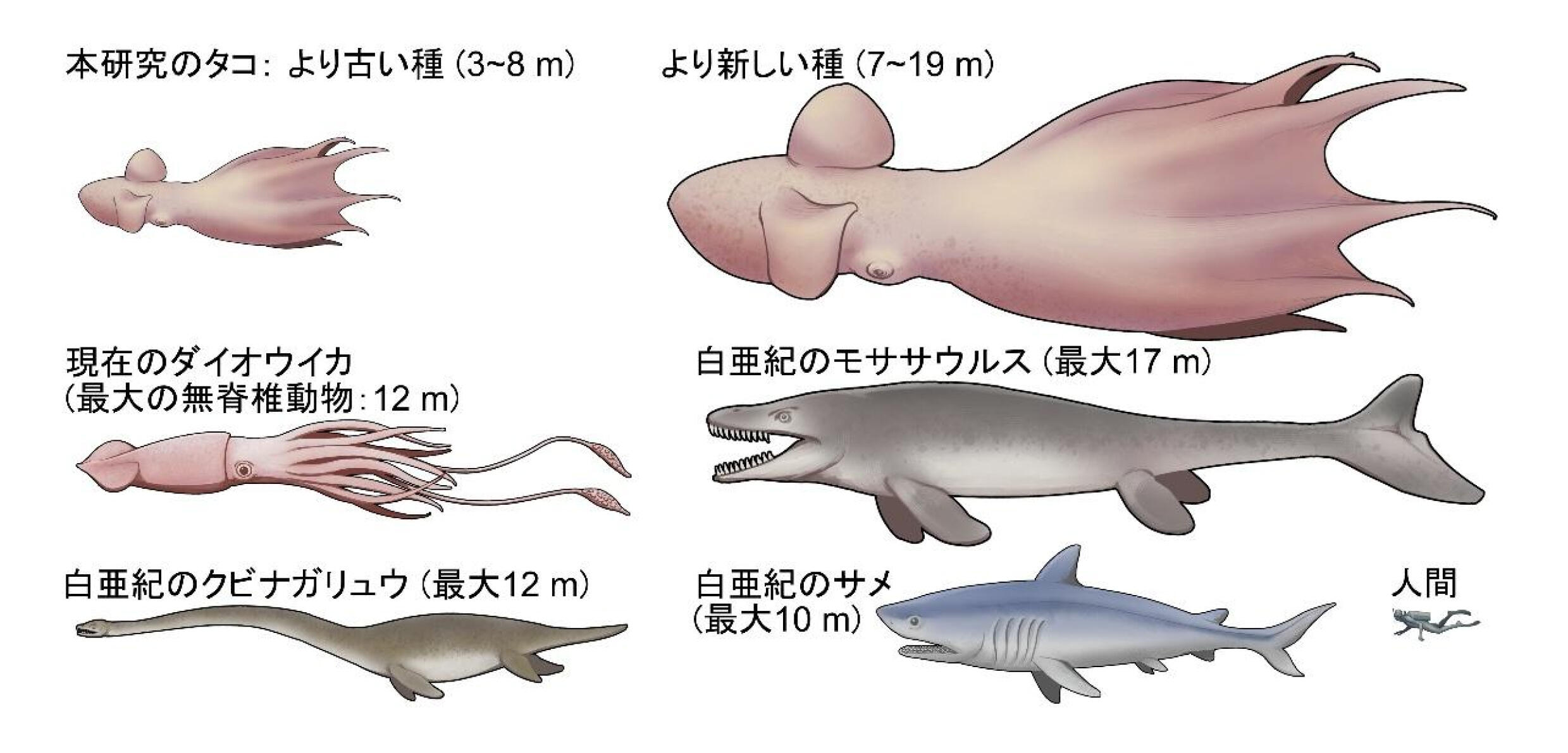 分類の結果、これまでタコ以外とされていたものを含む5種が、ヒゲダコ亜目*3の2種に統合されました。また、新たな標本には、これまでより約500万年古い、タコ類最古の記録が含まれます。体サイズ推定からは、より古い種が最大全長で約3~8m、より新しい種は約7~19mに達したことが示唆されました(図1)。これは、彼らが現生ダイオウイカ(最大12m)を超える地球史上最大の無脊椎動物であり、さらに同時期の頂点捕食者とされてきたモササウルス(最大17m)などを上回るサイズであった可能性を示します。また、新たに発見された幼体から、成長速度がより新しい種で向上しており、彼らが急速に巨大化したことが明らかになりました。