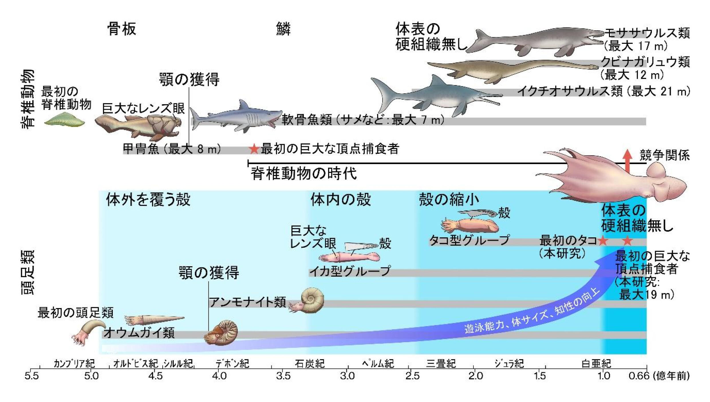 このモデルは、顎の獲得と体表の硬組織の喪失が、海洋の頂点捕食者への進化のカギであったことを示す。灰色の線は脊椎動物の頂点捕食者、及び頭足類の代表的なグループを示している。頭足類においては、青の背景で示したように段階的に殻が縮小する。