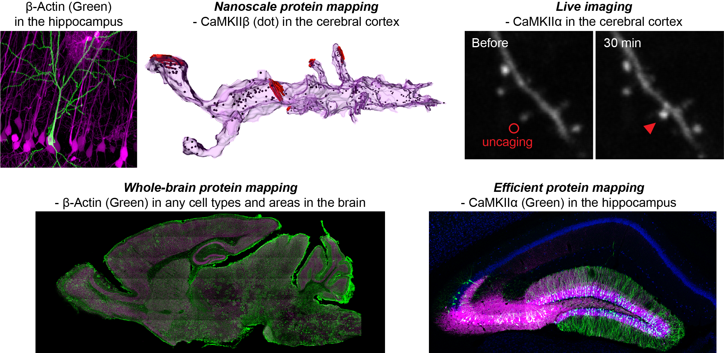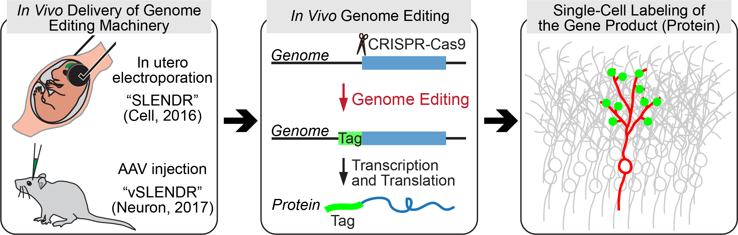Toward this goal, we are developing new, original techniques. For example, we have already established in vivo genome editing methods that are useful for high-throughput, high-resolution mapping of protein localization and dynamics in the mammalian brain (Cell 2016, Neuron 2017).